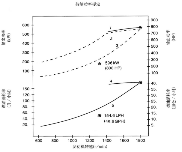 標定條件:功率標定是基于ISO8665標準規定的條件:大氣壓力為100kPa (29.612英寸汞柱),環境溫度為25℃(77°F),相對濕度為30%。螺旋槳軸功率為按97%扣除齒輪箱損失后的凈功率。燃油消耗是基于使用比重為838.9g/l(7.001磅/加侖),LHV為42780kJ/kW(18390Btu/lb)的35°API燃油。 1. 制動功率 kW(HP) 4. 軸功率對應的燃油消耗 2. 扣除齒輪箱損失后的軸功率 kW(HP) 5. 螺旋槳推進曲線對應的燃油消耗 3. 螺旋槳推進曲線 持續功率:這種功率標定的發動機允許在全負荷工況下連續不斷地使用。這種功率為ISO3046標準功率 * 對非LTA發動機,其燃油耗高1-3%。 | ||||||