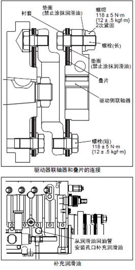 (b) 驅動器聯軸器和疊片的接合面如有雜質嵌入會引起打滑或損傷,使用前螺栓、襯套和墊圈要清洗干凈。
