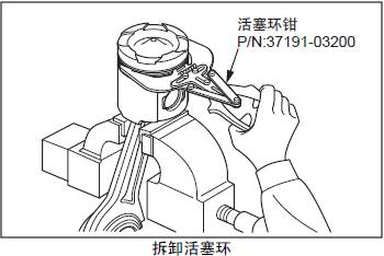 (5) 不斷調整支點位置,向上頂推三菱S12柴油發動機連桿和三菱S12柴油發動機活塞。當潤滑油環從三菱S12柴油發動機缸套內拔出后輕輕地擱置在三菱S12柴油發動機缸套上面。