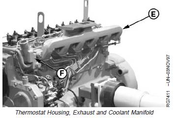5. Using guide studs, remove exhaust manifold (E).NOTE: On some engines, the thermostat housing/coolantmanifold (F) is part of the cylinder head.