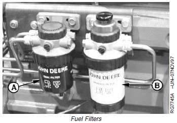 7. Disconnect fuel lines and remove fuel filter(s) (A) and(B) and mounting brackets as required.