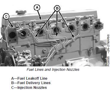 11. Remove fuel leakoff line (A) and fuel delivery lines (B)as an assembly. Remove fuel injection nozzles (C).See appropriate procedure: