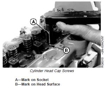 a. Make a reference mark (in-line) on socket (A) andcylinder head surface (B).