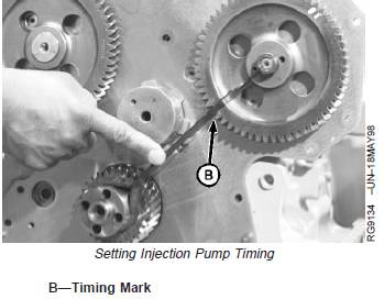 · Injection pump drive gear (B) and injection pump. See Section 02, Group 090 of CTM207 (Mechanical Fuel Systems), CTM170 (Level 4 Electronic Fuel Systems), CTM331 (Level 12 Electronic Fuel Systems), CTM284 (Level 1 Electronic Fuel Systems) or CTM220 (Level 11Electronic Fuel Systems with Denso High PressureCommon Rail).