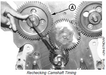 a. With JD254A (JD-254A) Timing Tool resting on nose of crankshaft and center of camshaft (as shown), turn camshaft until timing mark (A) on camshaft gear aligns with timing tool.