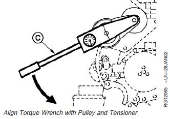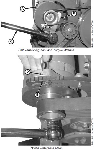 1. Install JDG1341 Belt Tension Gauge (A) on belt,