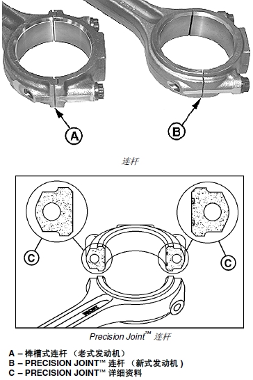老式John Deere約翰迪爾強鹿柴油發動機的連桿和連桿瓦蓋之間采用傳統的榫槽式連接 (A)。新式John Deere約翰迪爾強鹿柴油發動機具有 PRECISION JOINT™ 連桿和瓦蓋 (B)。