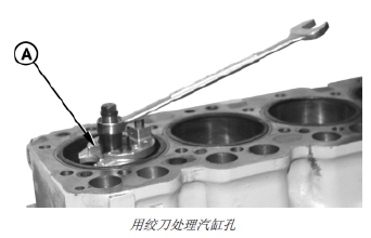 6. 用刮刀或絞刀 (A) 清除汽缸套孔中的積碳。用壓縮空氣去除汽缸體內的異物。