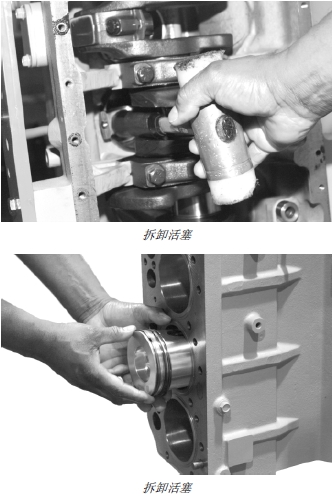 重要提示: 握住活塞,以防活塞掉落。活塞環脫離汽缸套后,活塞便會掉落。如果重復使用汽缸套,拆卸活塞和連桿總成時一定要格外小心,不要讓連桿撞擊汽缸套孔。