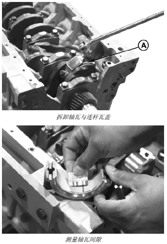 10. 拆卸活塞和連桿總成之前,用 PLASTIGAGE® 測量連桿軸瓦與軸頸之間的油隙。記錄測量值。(請參閱本章后面的“檢查和測量連桿軸瓦”部分。)