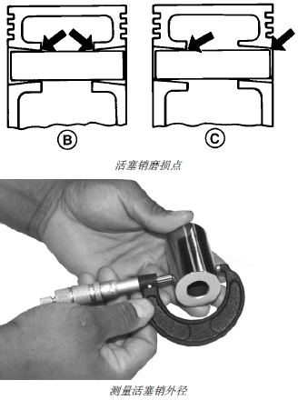 重要提示: 不要試圖打磨或修整活塞銷表面。活塞銷表面要求具有很高的光潔度。