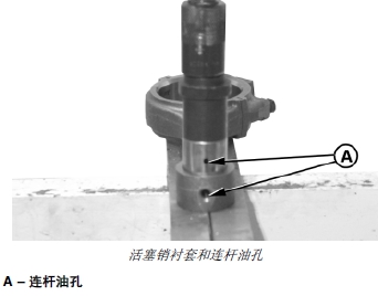 重要提示: 油孔 (A) 必須對準。如果油孔未對準,應拆卸襯套并報廢。安裝一個新襯套。襯套不得重復使用。將襯套裝入連桿。