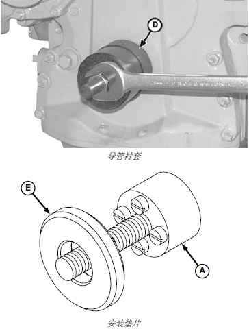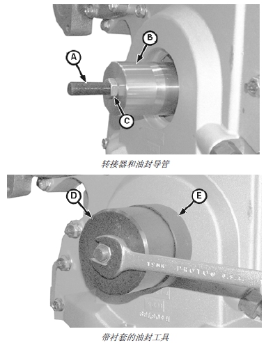 6 導管襯套 (E) 裝在安裝器和油封上。