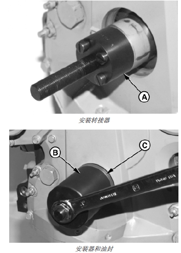 重要提示: 為保證安裝正確,曲軸和耐磨套外徑必須要用 Brake Kleen、IgnitionCleaner 或等效產品進行清洗,風干后再安裝油封 (C)。