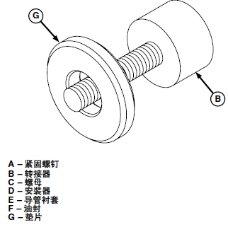 3. 在緊固螺釘上安裝 JDG954-7 轉接器 (B) 并用螺母(C) 固定。