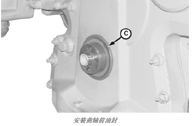 3. 在油封邊上涂上一層干凈的機油,將油封 (C) 裝在曲軸的凸緣上。(油封裝彈簧的一頭應先裝進正時齒輪蓋內。)