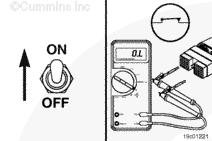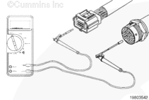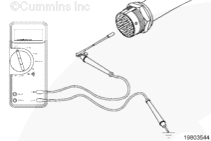 從康明斯電子控制模塊 (ECM) 上斷開原始設備制造商 (OEM) 線束接頭。將一根測試導線插入 OEM 線束接頭上的開關回路觸針,然后將鱷魚夾連接到萬用表表筆上。將另一根導線插入 OEM 線束接頭上的風扇控制開關信號觸針,然后將鱷魚夾連接到萬用表另一個表筆上。
