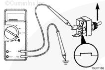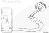 調整萬用表以便測量電阻。將測試導線插入 OEM 線束接頭上的風扇控制開關信號觸針,然后將其連接到萬用表表筆。使萬用表的另一根表筆接觸康明斯ISB5.9 G CM2180 發動機缸體接地。測量電阻。