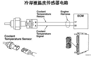 故障原因:在發(fā)動機線束的 22 號冷卻液溫度信號觸針上檢測到的電壓低于 0.21 VDC。
