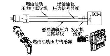 檢修方法是:康明斯筮動機上使用的壓力傳感器大多數(shù)為壓電晶體式。壓電晶體式傳感器通過內(nèi)部的一個壓電晶體來感應(yīng)壓力的變化,當壓力變化時,作用在壓電晶體上的壓差使壓電晶體輸出一個信號電壓。燃油油軌壓力傳感器就是此種類型,采用三線式,兩根電源線向傳感器提供5v的工作電壓,一根信號線向ECM提供壓力信號電壓,如圖1所示。