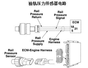 安裝在高壓燃油共軌內(nèi),其功能是:ECM利用該傳感器信號確定油軌中的燃油壓力,同時利用它來計算燃油供油量,工作范圍在0~1500 Ba,。傳感器出現(xiàn)故障將導(dǎo)致發(fā)動機動力下降、轉(zhuǎn)速降低甚至停車。