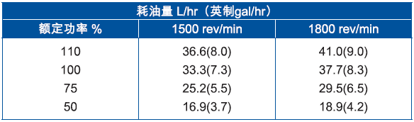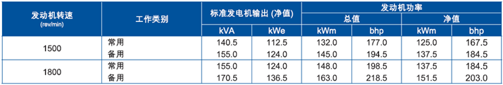 上表所有額定功率數據均為配備標準尺寸風扃與驅動器比率的發動機,ISO/TR 14396/IS0 8528條件下操作時數據。有關上述條件以外操作的數據請咨詢珀金斯公司,Perkins提供的性能公差為±5%。電氣參數假設功率因數為0.8與發動機效率90%。
