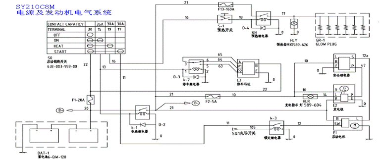 可能的原因:①啟動開關11號端子線未插好。②啟動開關損壞。③液壓操縱桿打開,④ K3損壞。⑤啟動馬達損壞,⑥ 電源繼電器損壞,