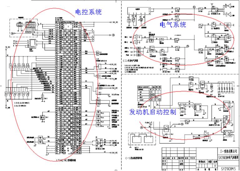SY210C8M啟動由上述控制電路獨立完成,控制器不參與啟動控制。發動機啟動達到標準轉速后,將由發電機P端控制安全繼電器,安全繼電器則斷開啟動繼電器,起動后啟動繼電器不再輸出。此時控制器完成發動機的發動, 充電報警燈熄滅。