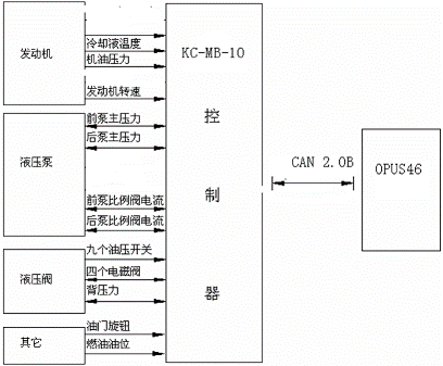 本系統由KC-MB-10控制器、OPUS46顯示、油門控制單元以及一些必要的模擬量、開關量傳感器、模式電磁閥組、開關閥等組成。通過對發動機和液壓泵系統進行綜合控制,使二者達到最佳匹配,以達到明顯的節能效果。