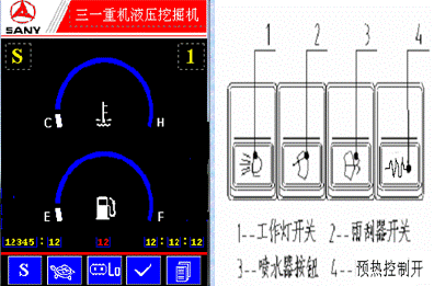 l 右操作面板黃色指示燈為發動機預熱指示燈,通過閉合位于后面的翹板開關,并將點火開關打到ON-START之間的預熱位置,此時指示燈亮,表示開始預熱。