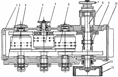 l—變速箱體、 2—大端蓋 、3—倒檔軸總成 、4—輸入軸法蘭、5—輸入軸總成 、6—中間軸總成7—后輸出法蘭 8—輸出軸 9—高低檔滑套 10—油底殼 11—前輸出法蘭 12—帶式制動器