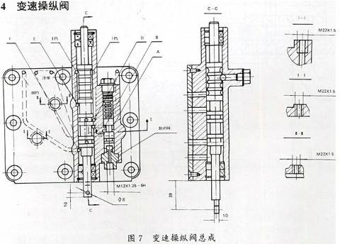 包括制動安全閥和變速閥。見圖。閥體上的A孔通變速器組合閥。當移動變速滑閥時,來自變矩組合閥的壓力油便可以分別流入孔D、E或F,(D通Ⅰ檔、E通Ⅱ檔、 F通倒檔)。閥體頂面上F點位置處Z1/8”螺孔為倒檔油壓輸出接口。