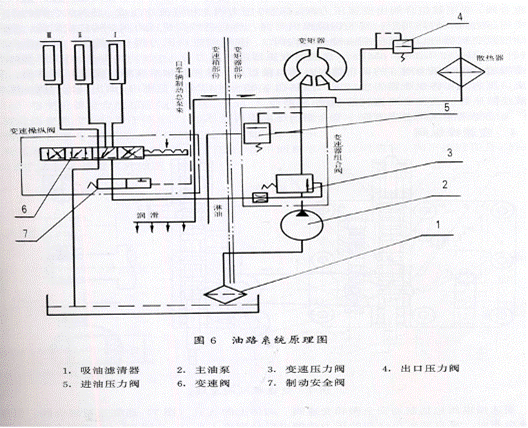 液力傳動油經變速泵輸出,經濾油器過濾后供給變速操縱閥(或減壓閥)。工作油液首先進入變速操縱閥的變速操縱油路,滿足變速要求,然后一部分油液再進入變矩器。