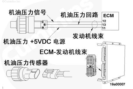 電子控制模塊 (ECM) 利用 OPS 監測機油壓力。ECM 監測信號觸針上的電壓并將它轉換成壓力值。ECM 將機油壓力值用于發動機保護系統。