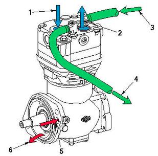 空氣壓縮機(jī)連續(xù)運(yùn)行,但有“負(fù)載”和“空載”兩種運(yùn)行模式。工作模式由壓力驅(qū)動調(diào)壓器和壓縮機(jī)卸荷閥總成控制。當(dāng)空氣系統(tǒng)達(dá)到預(yù)定壓力時,調(diào)壓器給卸荷閥總成施加一個空氣信號,使得卸荷閥打開或者關(guān)閉壓縮機(jī)進(jìn)氣門,于是壓縮空氣停止流入空氣系統(tǒng)。當(dāng)使用系統(tǒng)時,壓力下降。在預(yù)定壓力下,調(diào)壓器給壓縮機(jī)卸荷閥總成發(fā)出空氣信號,允許壓縮機(jī)再次向空氣系統(tǒng)泵入壓縮空氣。