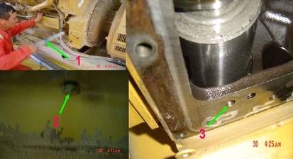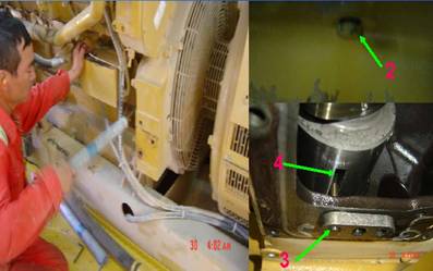 第一缸排氣沖程式上死點 并按柴油機正常轉向再將飛輪1轉動360°將定正時螺栓2擰入氣輪,凸輪固定銷孔3與凸輪軸銷孔4已對不上證明是第一缸排氣沖程式上死點。卡特彼勒柴油發動機|卡特彼勒柴油發動機氣門間隙調節技術|卡特彼勒柴油發動機氣門間隙調節資料|卡特彼勒柴油發動機氣門間隙調節維修服務商