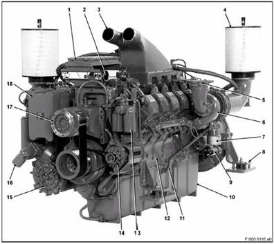 柴油機總體結構一般包括上述幾大系統,但由于汽缸數、汽缸排列方式和冷卻方式的不同,因此,各種機型在結構上略有差異。德國奔馳MTU柴油機的基本結構,如下圖所示。