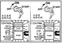 將車輛鑰匙開關(guān)扳至“ON”位置。如果沒有記錄現(xiàn)行故障代碼,兩個指示燈將亮起并保持這一狀態(tài)。如果記錄有現(xiàn)行故障代碼,兩個指示燈將瞬時亮起,然后開始閃爍記錄的故障代碼。