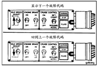 在指令系統(tǒng)開始其它操作之前,指示燈將一直閃爍同一個故障代碼。要想顯示下一個故障代碼,暫時把IDLE SPEED ADJUST開關(guān)扳到“(+)”位置,要想回到上一個故障代碼,把IDLE SPEED ADJUST開關(guān)暫時扳到“(-)”位置即可。如果只有一個現(xiàn)行故障,不論開關(guān)扳到“(+)”或“(-)”,系統(tǒng)都將連續(xù)顯示同一個故障代碼。
