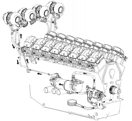 Perkins4016柴油發(fā)動(dòng)機(jī)正時(shí)齒輪由兩側(cè)油道潤(rùn)滑。齒輪系中兩個(gè)惰輪的軸承通過(guò)曲軸箱端部的凹槽用油道側(cè)面的機(jī)油潤(rùn)滑。氣門齒輪由機(jī)油濾清器底座供應(yīng)的機(jī)油潤(rùn)滑。機(jī)油管連接曲軸箱和油軌,以向氣門齒輪供油。機(jī)油通過(guò)支軸上沿雙頭螺柱的凹槽輸送至每個(gè)缸蓋,然后流向搖臂軸。搖臂軸中的徑向孔將機(jī)油輸送至搖臂的軸承。機(jī)油自主油道端部通過(guò)曲軸箱機(jī)油孔輸送至渦輪增壓器。用條管路輸送A排濾清器后的機(jī)油,以向V形中央的挺桿供油。