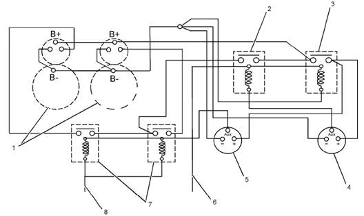 1)啟動馬達(dá) 2)繼電器1 3) 繼電器2 4)燃油電磁閥繼電器1 5) 燃油電磁閥繼電器2 6) 燃油電磁閥 7)起動繼電器 8)起動信號