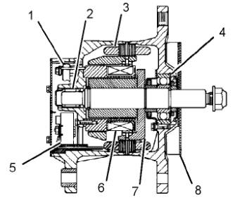 (1)調(diào)壓器 (2)轉(zhuǎn)子軸承 (3)定子繞組 (4)滾珠軸承 (5)整流橋 (6)勵磁繞組 (7)轉(zhuǎn)子組件 (8)風(fēng)扇