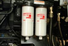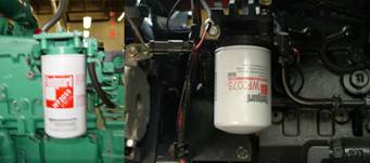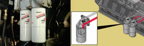 康明斯Cummins QSK23發動機左側裝有兩個弗列加 LF9325 機油濾清器。濾清器內有30微米全流濾清介質及10 微米旁通濾清介質。省去了旁通濾清器部分。