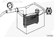 如圖所示,堵住機(jī)油冷卻器芯,并連接至壓縮空氣源。對(duì)每個(gè)機(jī)油冷卻器芯進(jìn)行壓力測(cè)試,以檢查有無(wú)泄漏。