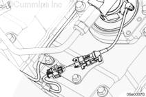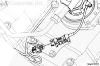 注: 如果發動機配備 CM2150 ECM (1),用一塊不起毛的布蓋住螺塞。將高壓燃油管最后一個噴油器的螺塞松開 1/4 至 1/2 圈。不必拆下螺塞以釋放壓力。連接 INSITE ™ 服務軟件,然后通過監測燃油油軌壓力核實燃油壓力已下降。