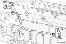 從位于發動機左排的回油歧管塊上拆下噴油器回油軟管。僅拆下回油歧管缸體端 (1) 的軟管。參考第 6 節中的步驟 006-013。