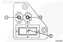 康明斯電子控制船用發(fā)動機配備了 2 個斷路器,位于發(fā)動機的 ECM 側。5 安斷路器 (1) 用于鑰匙開關控制的 ECM 電源,10 安斷路器 (2) 用于非鑰匙開關控制的面板電源。電路斷路器板上還安裝有 40-針 OEM 接頭(3)。