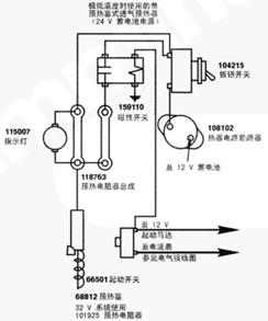 在 -23° C [-10°F] 以及溫度更低時,使用 24 V 起動電路,通過電路中如圖 14 所示的兩個電阻器,預熱塞可以提供更多的熱量。這避免了從蓄電池至預熱塞的電流降低,而此降低通常是由起動馬達施加的負載引起的。