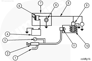 準備康明斯起動發動機,檢查燃油供給、冷卻液液位、變速箱或動力輸出裝置是否位于空檔,確定所有的手都接觸不到發動機。關閉預熱塞開關。(紅色指示燈會熄滅。)20 到 30 秒(預熱塞加熱所需時間)后,操作加注泵,起動發動機過程中保持 241 kPa [35 psi] 的燃油壓力。在低于 -34° C [-30°F] 的溫度下需要使用稍高的噴嘴壓力,因為燃油更稠。如有疑問,試起動之前先試用噴嘴。發動機起動前一般先轉幾圈。