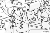 將直螺紋適配器 (1) 裝入機油濾清器座 (6) 中,其中螺塞已拆下。將 90 度彎頭 (2) 裝入適配器。將單向閥 (3) 裝入彎頭。單向閥上的箭頭必須指向彎頭,并且與油流方向一致。將陽性軟管適配器 (4) 裝入單向閥。將預潤滑軟管 (5) 連接到陽性軟管適配器。